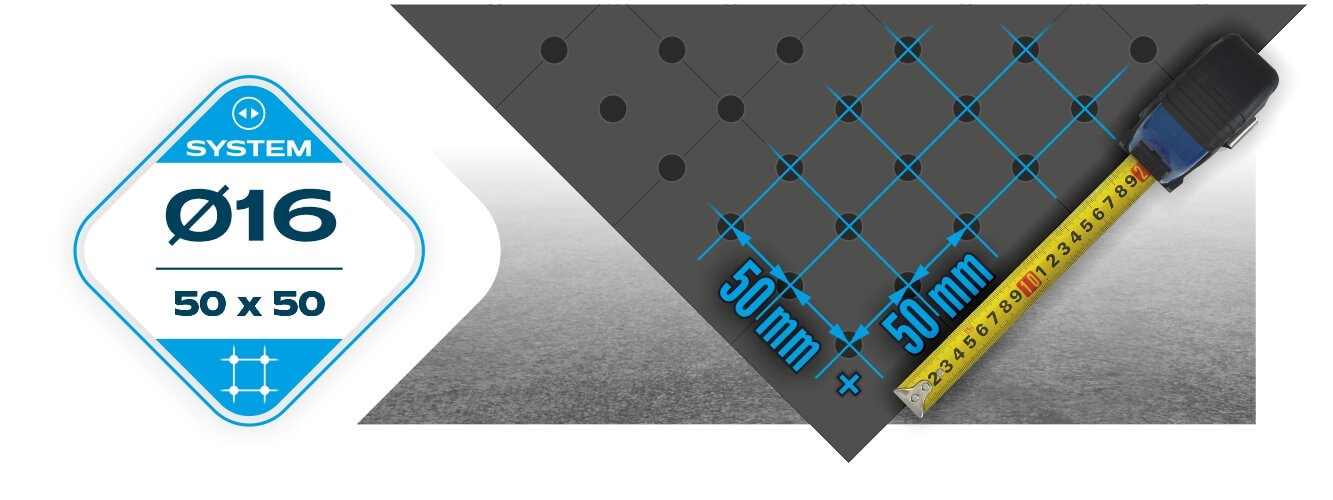 System otworów Ø16 zastosujesz do lżejszych i bardziej precyzyjnych prac oraz mniejszych konstrukcji. Jest najczęściej wybierany jako baza zrobotyzowanych stanowisk spawalniczych. Siatka otworów 50x50 mm pozwala na mocowanie narzędzi w większej ilości miejsc.