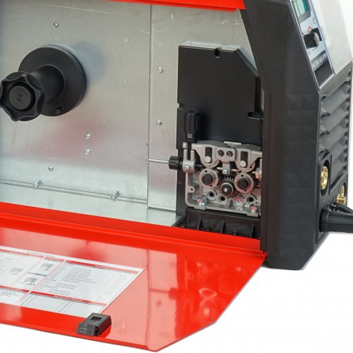 Mechanizm podający drut składa się z 4 rolek, które zapewniają mocny i równomierny docisk. Sprawia to iż drut podawany jest stabilnie i jednostajnie. Ma to zwłaszcza znaczenie przy stosowaniu uchwytów 5m.