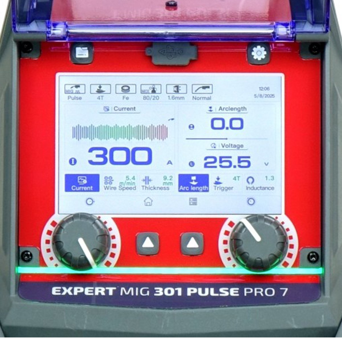 Migomat Ideal EXPERT MIG 301 Pulse Pro7 LCD jest wyposażony w nowoczesny, 7-calowy wyświetlacz LCD, który pozwala na intuicyjne ustawienie parametrów spawania. Użytkownik może szybko wybrać rodzaj materiału i jego grubość, a inteligentny system spawarki samodzielnie dostosuje parametry spawania dzięki trybowi synergicznemu.