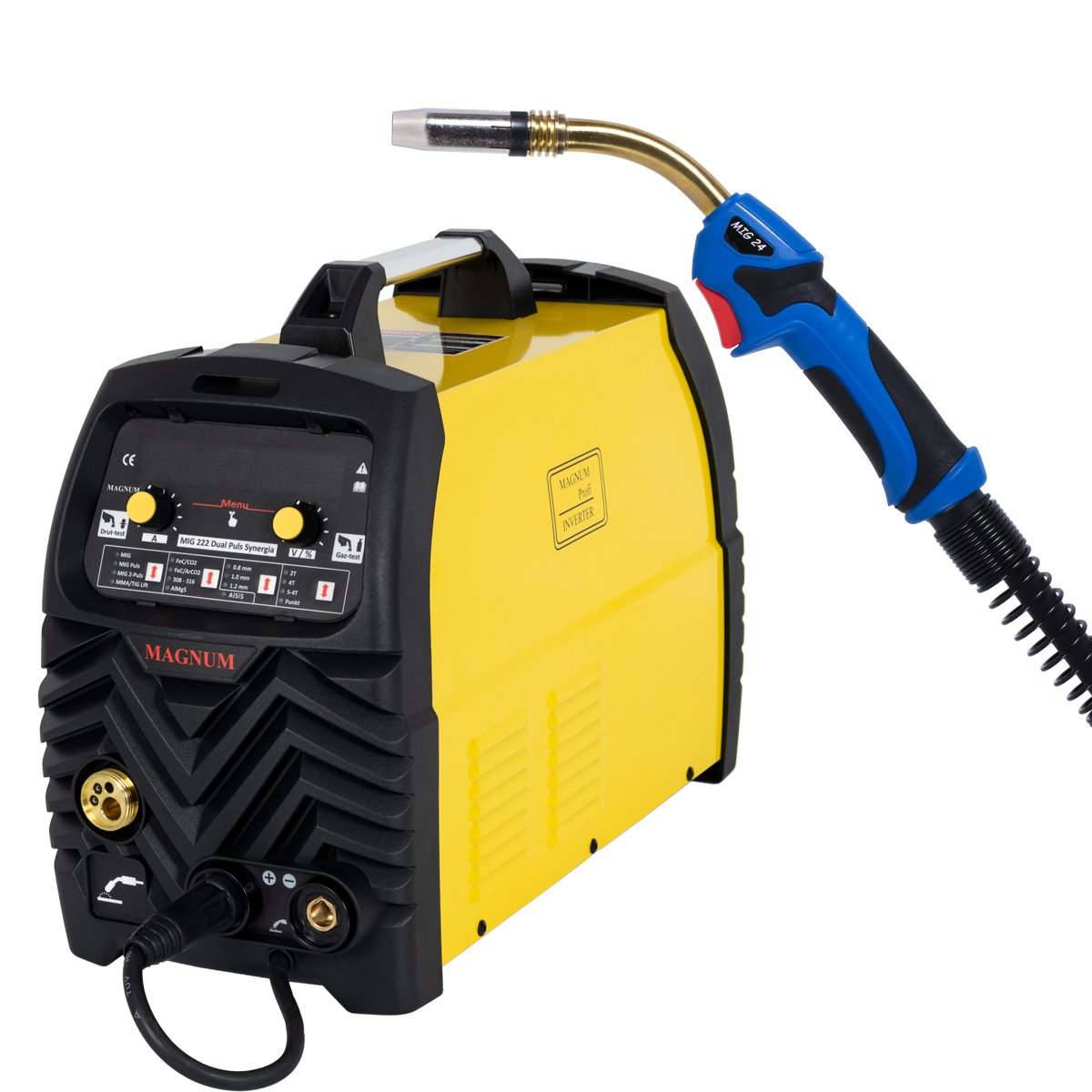 Magnum MIG 222 Dual Puls Synergia to nowoczesna zasilana z sieci jednofazowej synergiczna spawarka migomat z funkcją pojedynczej i podwójnej pulsacji o maksymalnym prądzie spawania 200 A w cyklu pracy wynoszącym 60%. Służy do spawania metodą MIG/MAG, MMA oraz TIG LIFT stali, stali nierdzewnych, aluminium i jego stopów i umożliwia lutospawanie blach ocynkowanych.