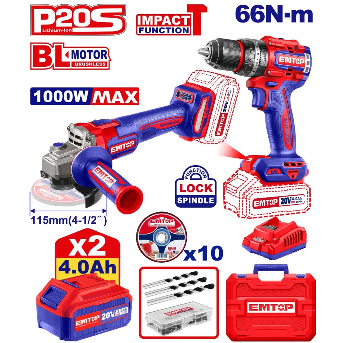 Kompatybilność Akumulatorowa P20S: Cały zestaw należy do systemu EMTOP P20S 20 V, co oznacza, że akumulatory są wymienne i pasują do wszystkich innych narzędzi 20 V tej marki.
